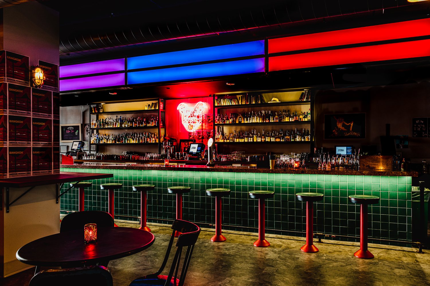 The interior design creates an immersive 1970s-inspired environment featuring plush velvet and leather seating, low ambient lighting, and eclectic wall art sourced from flea markets and vintage shops. The spacious layout includes intimate booths, cushy center couches, and bar counter seating, while a pool table and pinball machines add interactive elements. Every vintage accent and furniture piece tells a story, from the plant fixture that "stares" at guests to the carefully curated glassware collection that enhances each cocktail's presentation.