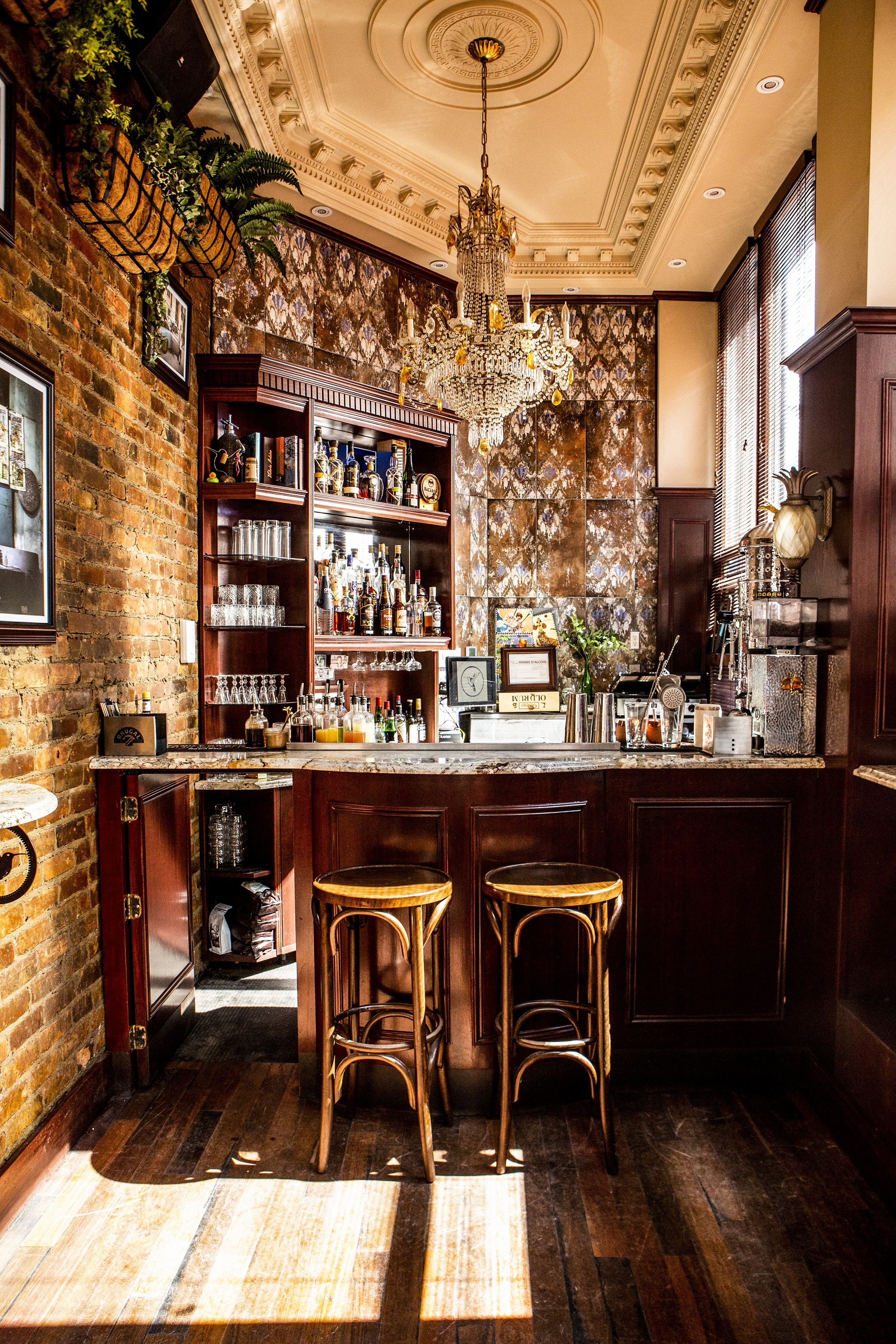 Exposed brick walls frame restored crown molding, while granite surfaces reflect light from an ornate chandelier that could have graced a Havana casino. The design preserves elements from the space's former incarnation as a gift shop, layering Montréal's heritage beneath Cuban nostalgia. Two precious bar seats face nine standing positions, ensuring every guest enjoys front-row access to the mixological theater. The proximity breeds conversation—bartenders become storytellers, strangers become friends, and every evening unfolds like a scene from pre-revolution Havana.