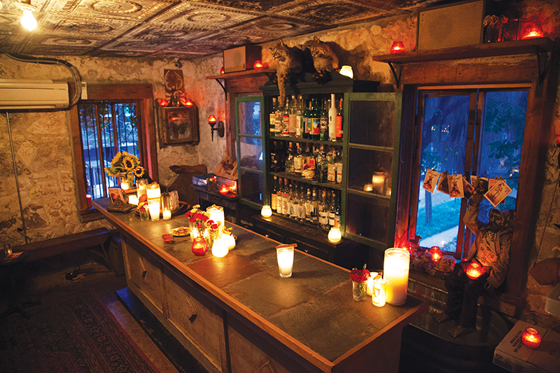 The 30-seat space evokes a candlelit Oaxacan hideaway, with weathered stone walls, corrugated metal surfaces, and glowing veladora candles creating an atmosphere of mystical intimacy. Vintage Mexican photographs, authentic artifacts, and rustic furnishings transform this elevated perch into a transportive cultural experience. The treehouse-like setting offers glimpses of East Sixth Street below while maintaining complete immersion in mezcal's sacred world.