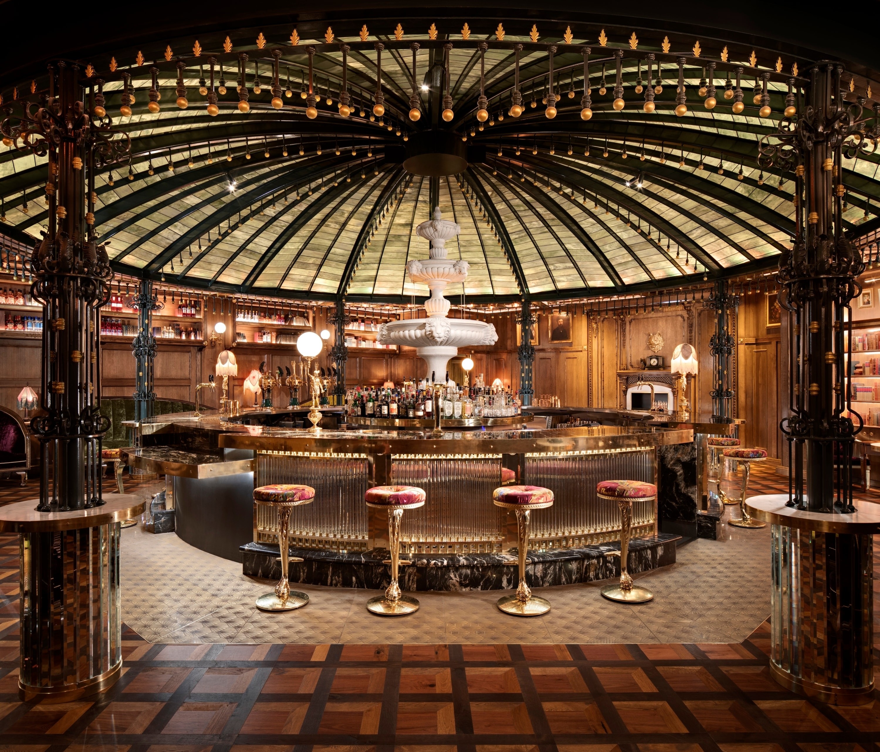 Paul Basile's award-winning design transports guests to early 1900s Paris through French Art Nouveau aesthetics. The vintage European liquor shop facade features ornate molding, stained glass, and brass wolf-head details with vintage lanterns. Inside, the centerpiece 22-foot African Gold marble bar sits beneath a massive stained-glass gazebo equipped with programmable LED lighting that mimics natural light progression from sunrise to sunset. Imported London "claw and ball" bar stools complete the immersive atmosphere, where every detail evokes luxury, mystery, and timelessness.