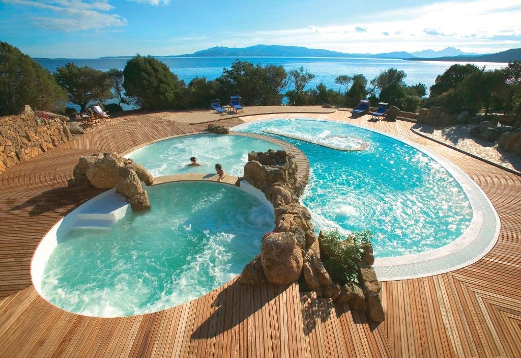 Facilities center on the L'Incantu Thalasso & Spa, a seawater therapy center offering targeted programs for relaxation and recovery, plus a heated seawater pool located near the spa. Wellness packages such as the Thalasso Discovery combine hydrotherapy and massages, while the fitness area provides cardio equipment for brief workouts. Dining options include Il Paguro on the Cala Capra terrace, serving local seafood for lunch and dinner; L'Île Flottante offers romantic dinner settings; a pizzeria and main restaurant handle casual and half-board meals. Outdoors, guests can play at the nine-hole Pitch & Putt golf course, relax on private wood‑platform beaches and hammocks at Cala Capra and Cala Selvaggia, or board yachts from the private marina for trips to the La Maddalena Archipelago and Corsica.
