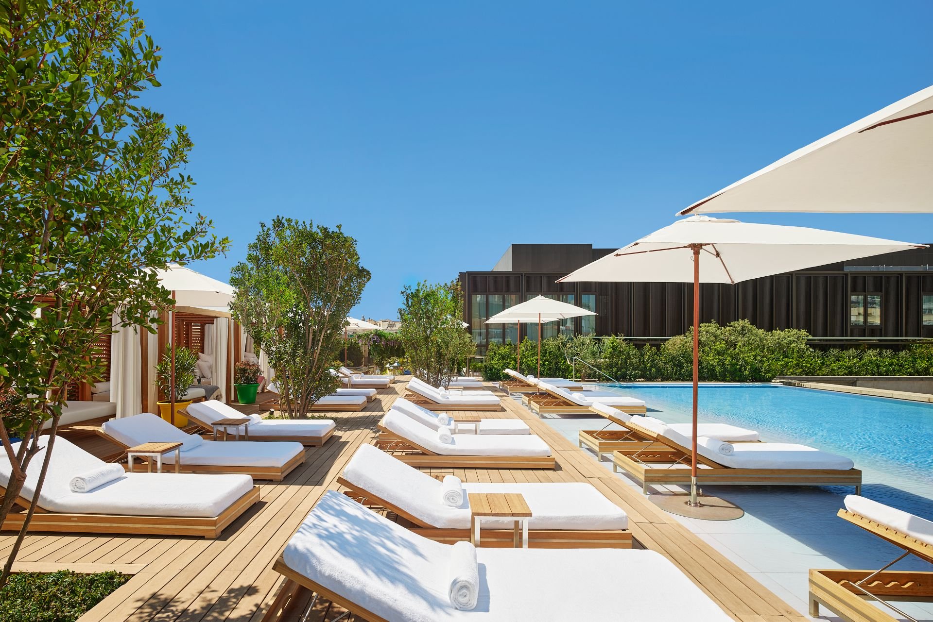 Facilities are centered on social life and wellbeing. The rooftop infinity pool offers sunbeds, a pool bar and private cabanas for relaxed daytime hours and skyline views at dusk. The Spa and a well-equipped gym provide quiet recovery after city sightseeing. Dining covers five distinctive venues: Oroya, led by Peruvian chef Diego Muñoz with a multi-course tasting menu and cocktail program; Scarpetta’s modern Italian plates; the intimate Punch Room serving speakeasy punches; the sculptural Lobby Bar with a pool table and late-evening service; and MISTICA, which hosts DJ-curated nightlife. These outlets are designed to attract both guests and locals, so reservations are recommended for evening dining and rooftop tables. Event planners can combine indoor studios with terrace space to craft private receptions against a Madrid backdrop.