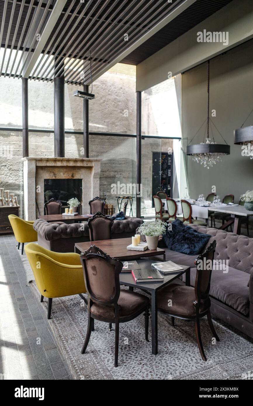Dining unfolds across three distinctive spaces within the restored monastery: the intimate Salón with its soaring vaulted ceilings and communal fireplace, the tranquil cloister patio surrounded by ancient arches, and the spectacular rooftop terrace offering panoramic views of Arequipa's iconic volcanoes. Architectural firm Obra Gris masterfully integrated contemporary elements with the original sillar ashlar masonry, creating an atmosphere that balances monastic serenity with modern luxury.