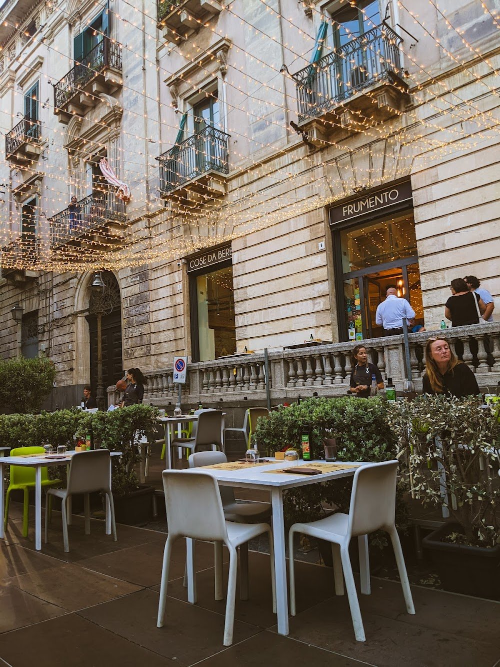 The atmosphere at Frumento is casual yet refined, a fit for both neighborhood diners and visitors drawn to Acireale’s historic center. Outdoor seating places guests directly on Piazza Giuseppe Mazzini, offering people-watching and evening breeze. Inside, the space favors straightforward, comfortable furnishings and an open sense of light; original architectural elements from the square inform the layout and add character without pretense. Service is table-based and attentive, focused on learning guest preferences and suggesting Margherita variations or local wines. The restaurant operates evenings from 18:00 to 00:00 daily, making it a reliable choice for dinner after a day of sightseeing in Sicily.