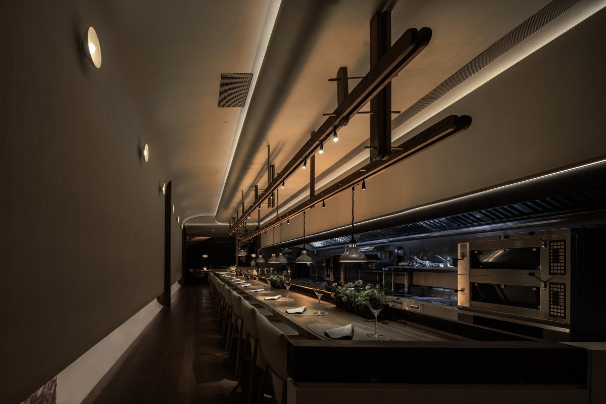 The space, designed by Ruhaus Studio, reads as rustic elegance with modern restraint. Materials are chosen for comfort and tactility: warm wood beams, textured stone surfaces, and curated greenery near the curtain wall give the dining room a calm, nature-influenced feel. Lighting is calibrated to shift from bright daytime lunches to intimate evening dinners without harsh contrasts. The bar area serves both as a gathering point and as a viewing line into the service rhythm; it is described as the quiet root while the dining section spreads outward. Service moves with steady pacing, servers explain each dish’s origin, and the staff can recommend wine pairings drawn from a French-forward selection. Acoustic levels remain conducive to conversation, and the overall effect is refined but approachable.