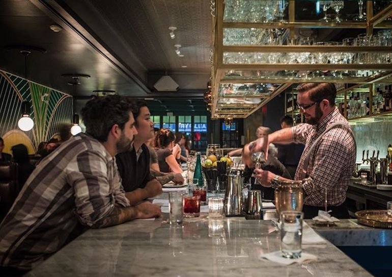 The 85-seat space unfolds across three distinct areas: the front 'garden' room with deep purple booths and Art Deco paneling, the central brasserie facing the raw bar, and the intimate rear salon adorned with vintage artwork and antiques. Head bartender Christopher Weaver crafts cocktails that complement sommelier Christopher Wickens' French-focused wine program, emphasizing Champagne and Burgundy selections. The signature La Banane Royale cocktail perfectly embodies the restaurant's playful sophistication.