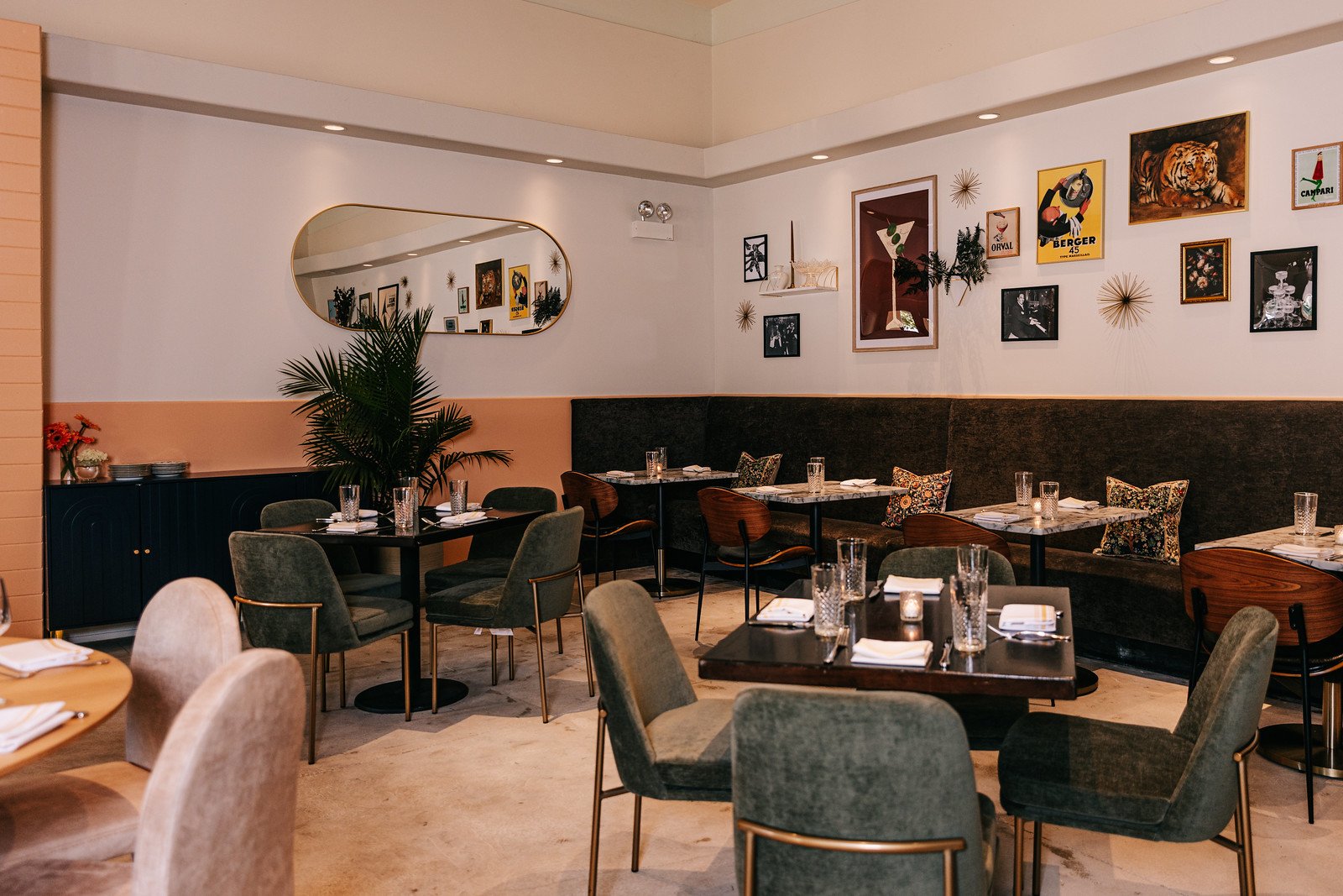 Inside, the dining room channels 1930s Los Angeles with paintings and photographs on the walls and cushioned chairs that recall classic Hollywood dining rooms. The space is warm and intimate, lit by candlelight and arranged to support conversations while still feeling lively on busy Friday nights. A few tables at the entrance look toward the street, then the room opens to a more private, buzzing area. Service at Oliver's is attentive and personal; staff guide wine choices and explain finishing touches. The beverage program leans wine-forward with curated suggestions like a honeyed Couly-Dutheil Chenin Blanc, matched to rich or truffled plates. There is no ostentatious cellar announcement—rather a steady, well-made selection that complements the menu.