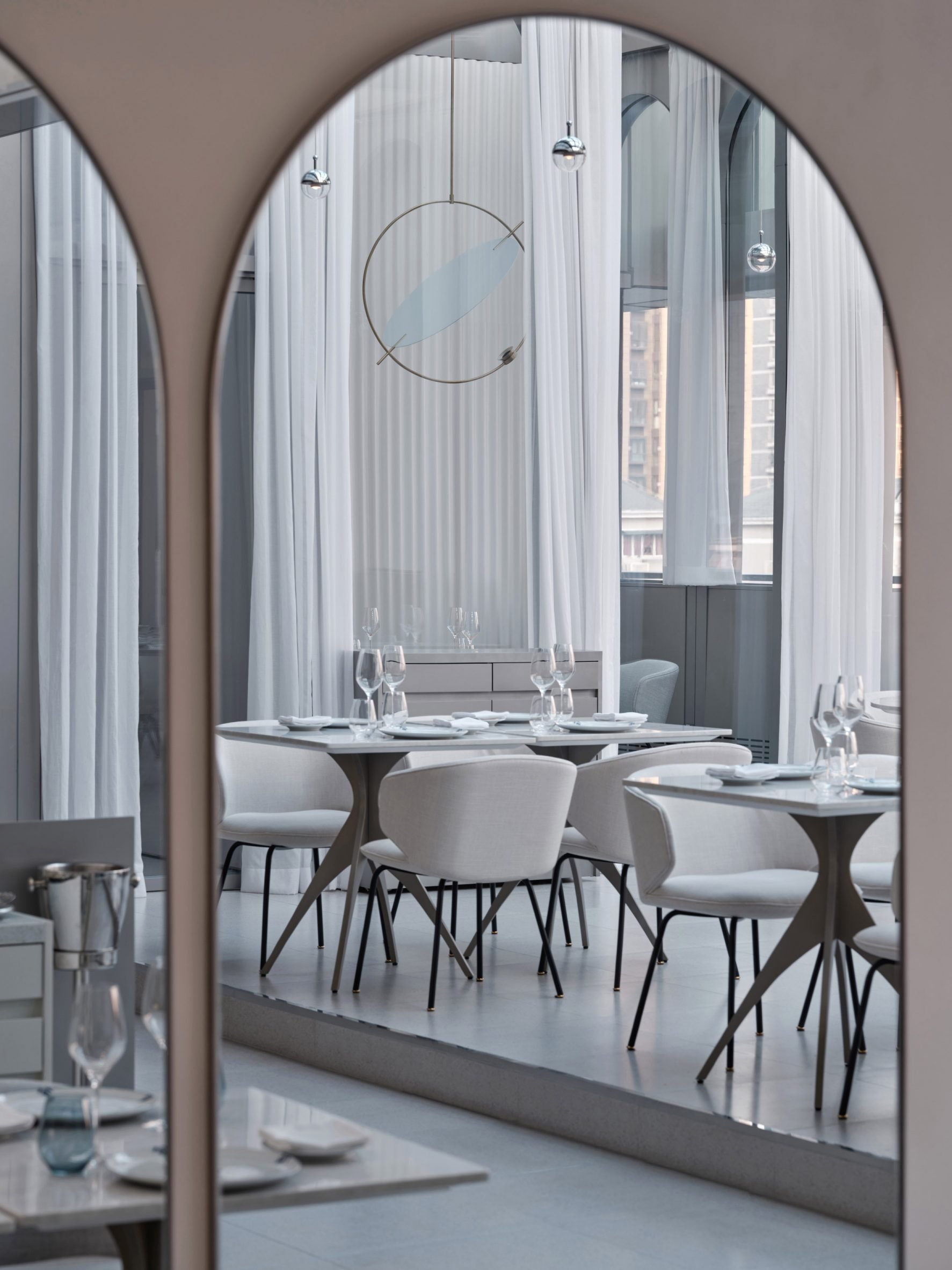 The room amplifies the menu. Interiors retain original 20th-century architectural cues from the Shanghai Power Company Building and layer in contemporary furnishings that allow for pockets of intimacy within a shared dining canvas. Potted palms and high ceilings frame long banquettes and small tables alike. Service is formal without stiffness: white-jacketed servers present a champagne cart, perform table-side pours, and circulate a dessert trolley with practiced ease. Lighting stays warm and even; the soundtrack is curated to lift conversation. These details create an inviting atmosphere for date nights, business meals and celebratory dinners throughout Shanghai.