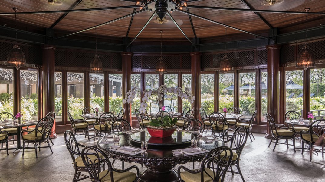 The dining room at Spices favors dark bamboo seating, bronze cutlery and floor-to-ceiling windows that frame the pool and garden. A glass-enclosed pavilion offers quieter seating and an open feel, while the enclosed dining area suits private conversations and business meals. Lighting is deliberately warm without being dim; tables are spaced for privacy, and material choices—wood, stone, floral accents—reinforce the Southeast Asian concept. Service follows a luxury hotel cadence: attentive but unobtrusive. Team members are trained to explain dishes, suggest spice adjustments, and accommodate dietary restrictions. The restaurant’s Balinese-inspired touches and the presence of a koi pond outside create a calm, refined backdrop rather than a theatrical show.