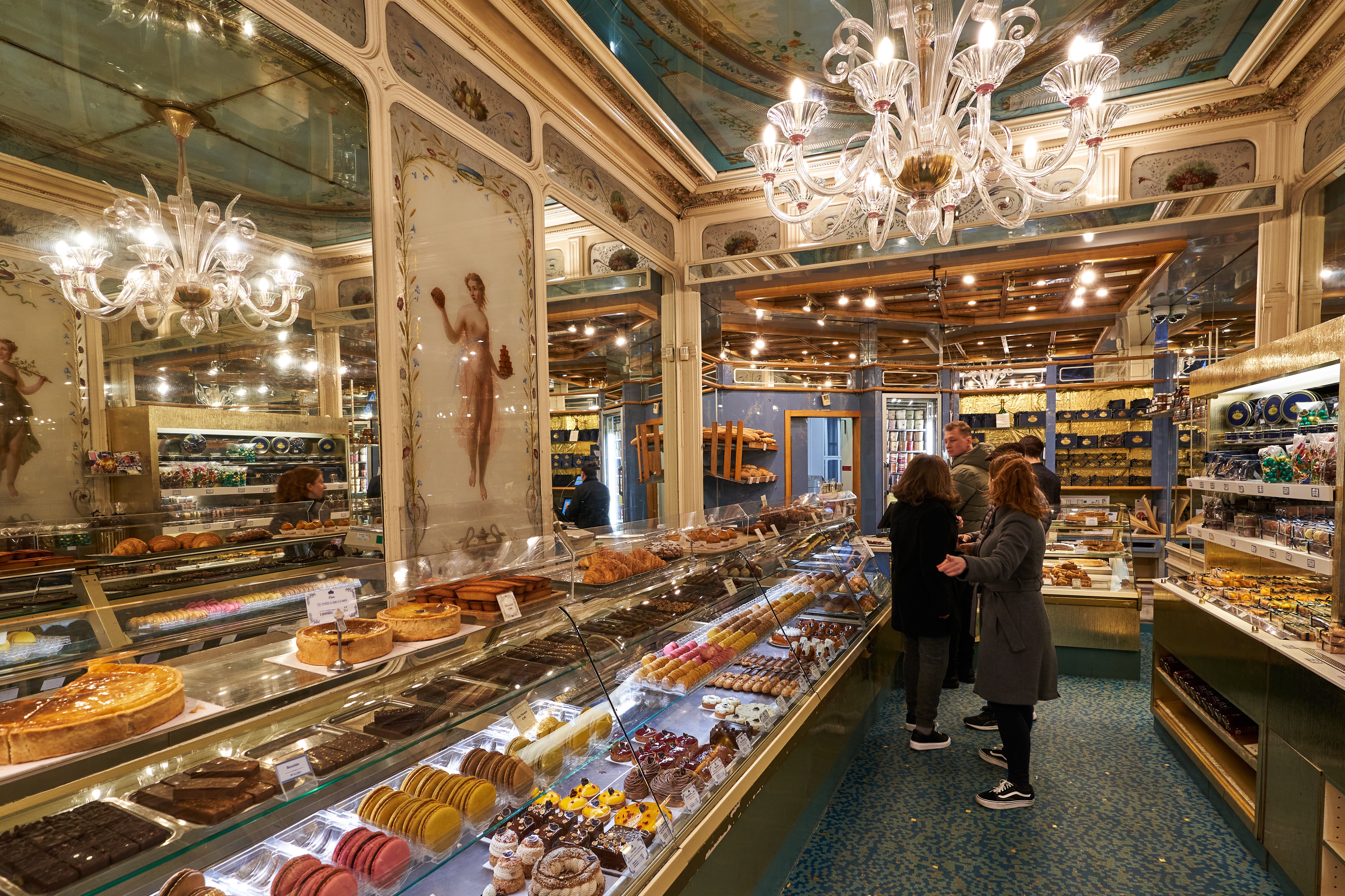 The interior at Stohrer reinforces the historical narrative: 19th-century frescoes painted by a student of Paul-Jacques-Aimé Baudry, ornate moldings, and compact seating create an intimate setting for pastry service. Expect counter ordering and limited table space rather than formal table service; the guest journey is direct—choose at the case, pay at the counter, enjoy on-site if seating allows, or take away. Staff work efficiently behind glass displays, often explaining choices to curious visitors. The atmosphere blends neighborhood pace with tourist interest, producing a lively but orderly environment. The smell of butter, caramel, and freshly baked dough defines the space more than music or décor trends.